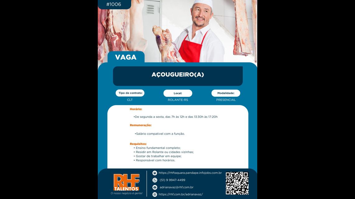 Estamos em busca de um(a) Açougueiro(a) dedicado(a) e responsável para atuar na manipulação, corte e preparo de carnes, mantendo os padrões de qualidade, higiene e segurança exigidos. O profissional também será responsável por organizar o ambiente de trabalho e colaborar com a equipe para garantir um bom funcionamento do setor.
