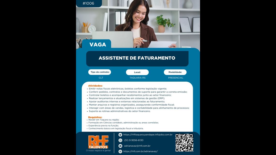 Estamos em busca de um(a) Assistente de Faturamento para atuar nas rotinas administrativas e financeiras da empresa, garantindo a correta emissão de documentos fiscais e o cumprimento da legislação vigente.